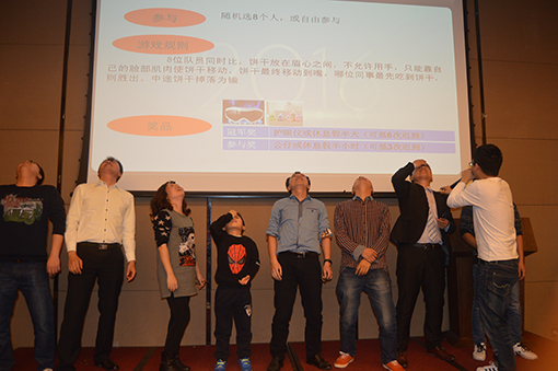 脖子最酸獎(jiǎng):圖為員工們參加“擠眉弄眼”游戲中努力讓臉上的餅干不掉下來(lái)